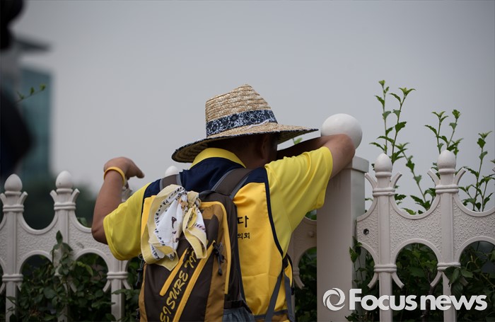 (서울=포커스뉴스) 416가족협의회와 4월16의약속국민연대가 28일 오후 서울 여의도 국회 앞에서 '20대 국회 6월 임시국회에 특별법 개정 촉구' 기자회견을 가졌다. 한 유가족이 국회 울타리 앞에서 슬픔에 잠겨 있다.