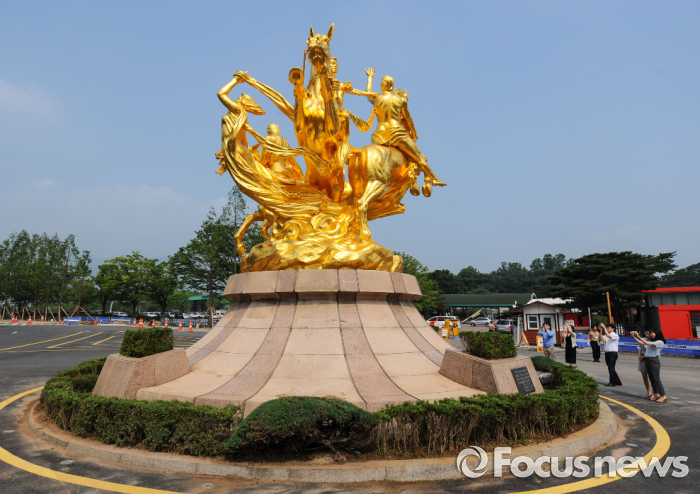 (서울=포커스뉴스) 한국마사회는 28일 경기도 과천시에 위치한 렛츠런파크 서울에서 30년 만에 새 단장한 '금동천마상'을 최초 공개했다.