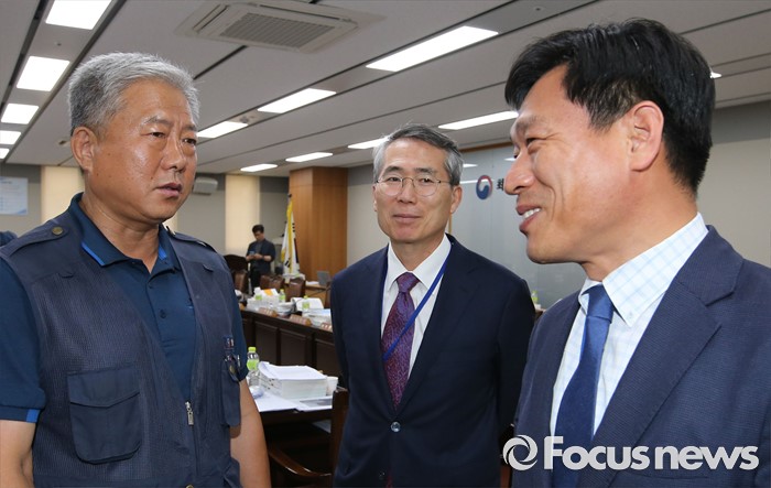 (세종=포커스뉴스) 28일 오후 세종시 정부세종청사 고용노동부 최저임금위원회 전원회의실에서 열린 제7차 전원회의가 정회돼, 김동만(왼쪽) 한국노총 위원장이 전원회의실을 방문, 박준성(가운데) 최저임금위원회 위원장과 류경희 부위원장과 대화를 하고 있다.