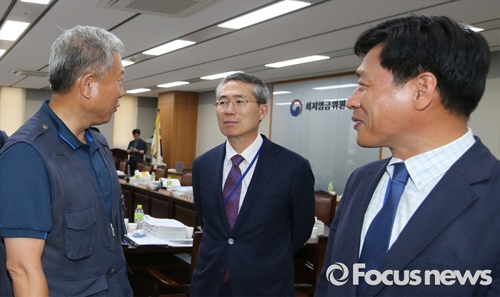 (세종=포커스뉴스) 28일 오후 세종시 정부세종청사 고용노동부 최저임금위원회 전원회의실에서 열린 제7차 전원회의가 정회돼, 김동만(왼쪽) 한국노총 위원장이 전원회의실을 방문, 박준성(가운데) 최저임금위원회 위원장과 류경희 부위원장과 대화를 하고 있다.