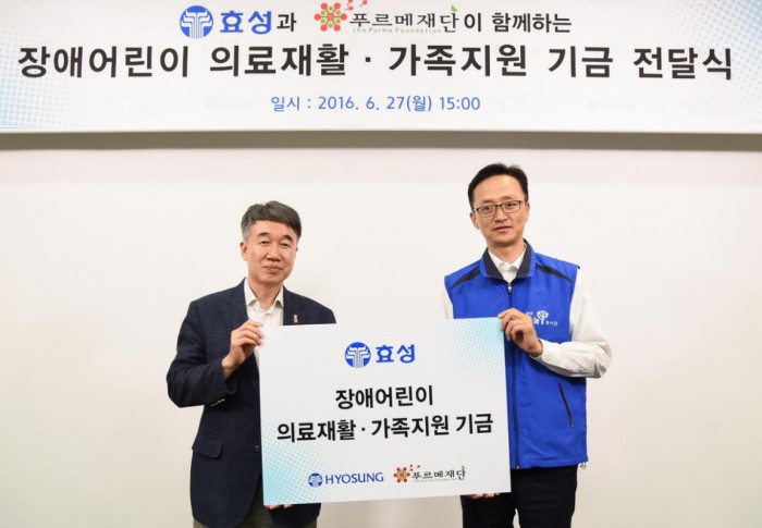 (서울=포커스뉴스) 효성은 지난 27일 서울 마포 상암동에 있는 어린이재활병원에서 저소득층 장애어린이·청소년 의료재활과 가족 지원기금 8000만원을 의료재활 전문기관인 푸르메재단에 전달했다고 28일 밝혔다.