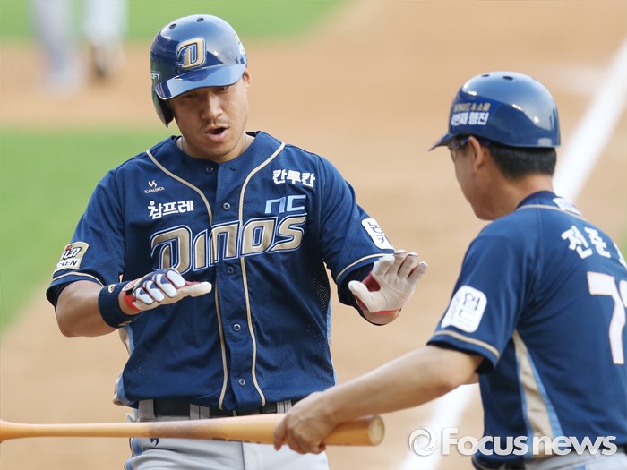 (서울=포커스뉴스) 28일 서울 잠실구장에서 열린 2016 프로야구 NC-두산 경기 2회초 NC 선두타자 조영훈이 두산 투수 니퍼트의 초구를 떄려 우월 솔로 홈런을 치고 전준호 코치의 환영을 받으며 홈인하고 있다.