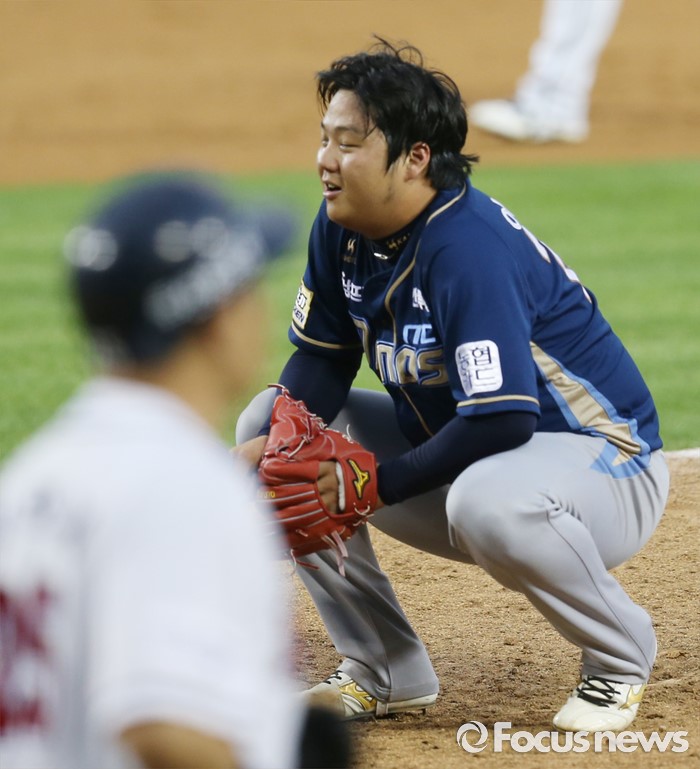 (서울=포커스뉴스) 28일 서울 잠실구장에서 열린 2016 프로야구 NC-두산 경기 4회말 무사 1,2루에서 NC 투수 이민호가 두산 양의지에게 볼넷을 내주고 마운드에 쭈그려 앉아 아쉬워하고 있다.