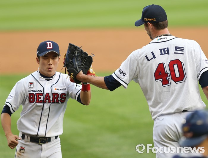 (서울=포커스뉴스) 28일 서울 잠실구장에서 열린 2016 프로야구 NC-두산 경기에서 두산 투수 니퍼트가 3회 수비를 마치고 덕아웃으로 들어가며 3루수 허경민과 글러브를 마주치고 있다.