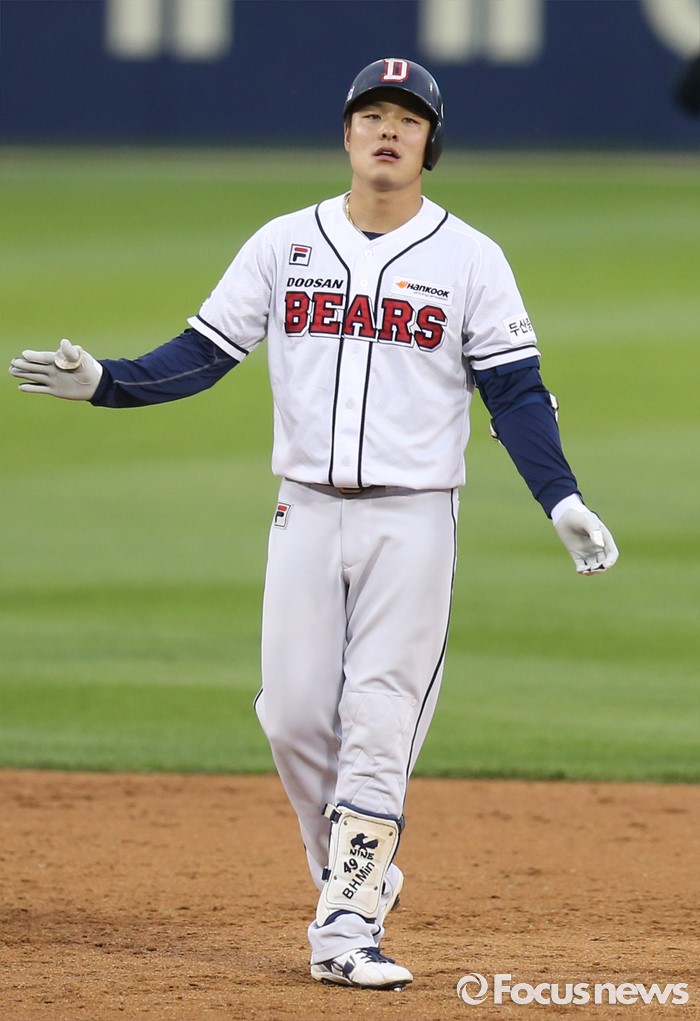 (서울=포커스뉴스) 28일 서울 잠실구장에서 열린 2016 프로야구 NC-두산 경기 4회말 무사 1,3루에서 두산 민병헌이 동점 좌중간 2루타를 치고 2루에서 박수를 치고 있다.