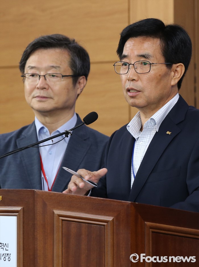 (세종=포커스뉴스) 이근성 낙농진흥회장이 28일 오후 세종시 농림축산식품부 기자실에서 2016년 원유기본가격을 전년보다 18원 인하한 리터당 922원으로 결정했다고 밝히고 있다. 왼쪽은 박상도 한국유가공협회 전무