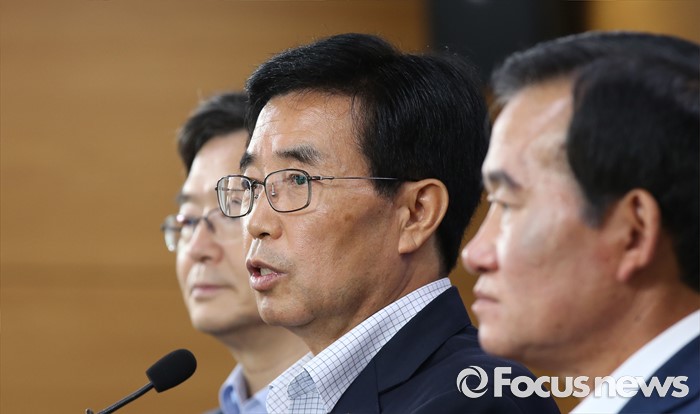 (세종=포커스뉴스) 이근성 낙농진흥회장이 28일 오후 세종시 농림축산식품부 기자실에서 2016년 원유기본가격을 전년보다 18원 인하한 리터당 922원으로 결정했다고 밝히고 있다. 왼쪽부터 박성도 한국유가공협회 전무, 이근성 낙농진흥회장, 신관우 충북낙농협동조합장.