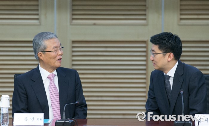 (서울=포커스뉴스) 29일 오전 서울 여의도 국회 의원회관에서 열린 아젠다 2050 창립총회에 참석한 김세연(오른쪽) 새누리당 의원, 김종인 더불어민주당 비대위 대표가 대화하고 있다.