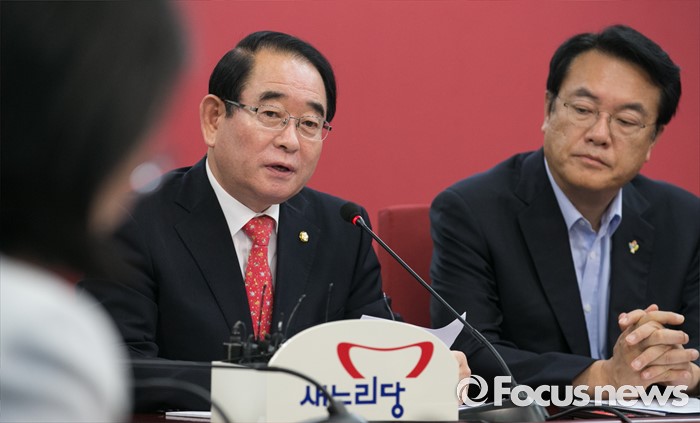 (서울=포커스뉴스) 박명재 새누리당 사무총장이 29일 오전 서울 여의도 당사에서 열린 혁신비대위원회의에 참석해 발언하고 있다. 오른쪽은 정진석 원내대표.
