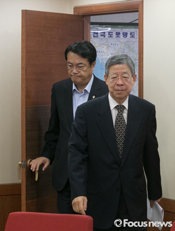 (서울=포커스뉴스) 김희옥(오른쪽) 새누리당 혁신비상대책위원장과 정진석 원내대표가 29일 오전 서울 여의도 당사에서 열린 혁신비대위원회의에 참석하고 있다.