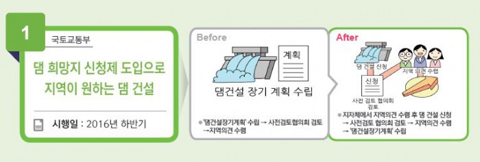 ▲올해 하반기부터 지방자치단체가 지역 의견을 수렴해 중앙정부에 댐 건설을 신청하면 중앙정부가 타당성을 검증해 댐 건설 장기계획에 반영하는 '댐 희망지 신청제'가 도입된다. 댐건설을 희망하는 지자체가 댐건설 신청을 하면 된다.2016년 하반기부터 이렇게 달라집니다. <출처=기획재정부>