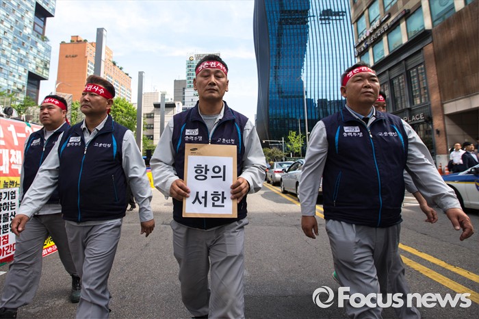 (서울=포커스뉴스) 29일 오전 서울 서초구 삼성 사옥 앞에서 삼성중공업 노동협의회 관계자들이 구조조정에 반대하는 시위를 하고 있다. 삼성중공업은 지난 15일 임원들의 임금 반납, 희망퇴직 등이 포함된 구조조정안을 공개했으며 올해 약 1500명 규모의 희망퇴직을 단행할 계획이라 밝혔다.