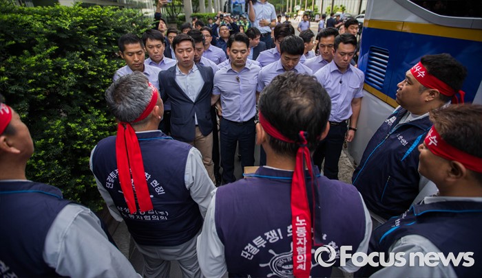 (서울=포커스뉴스) 29일 오전 서울 서초구 삼성 사옥 앞에서 삼성중공업 노동협의회 관계자들이 구조조정에 반대하는 항의서한을 삼성 측에 전달하기 위해 삼성의 보안요원들과 대치하고 있다. 삼성중공업은 지난 15일 임원들의 임금 반납, 희망퇴직 등이 포함된 구조조정안을 공개했으며 올해 약 1500명 규모의 희망퇴직을 단행할 계획이라 밝혔다.
