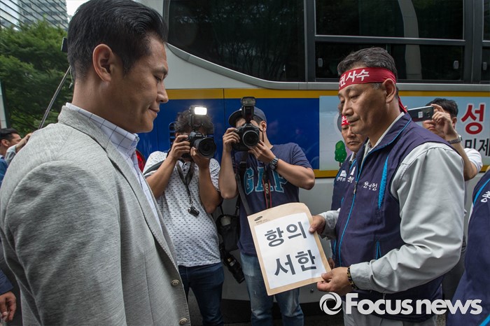 (서울=포커스뉴스) 29일 오전 서울 서초구 삼성 사옥 앞에서 삼성중공업 노동협의회 관계자들이 구조조정에 반대하는 항의서한을 삼성 측에 전달하고 있다. 삼성중공업은 지난 15일 임원들의 임금 반납, 희망퇴직 등이 포함된 구조조정안을 공개했으며 올해 약 1500명 규모의 희망퇴직을 단행할 계획이라 밝혔다.