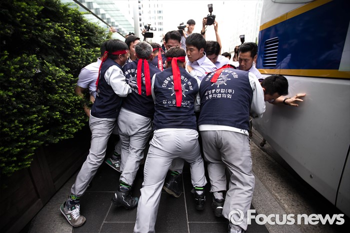 (서울=포커스뉴스) 29일 오전 서울 서초구 삼성 사옥 앞에서 삼성중공업 노동협의회 관계자들이 구조조정에 반대하는 항의서한을 삼성 측에 전달하기 위해 삼성의 보안요원들과 대치하고 있다. 삼성중공업은 지난 15일 임원들의 임금 반납, 희망퇴직 등이 포함된 구조조정안을 공개했으며 올해 약 1500명 규모의 희망퇴직을 단행할 계획이라 밝혔다.