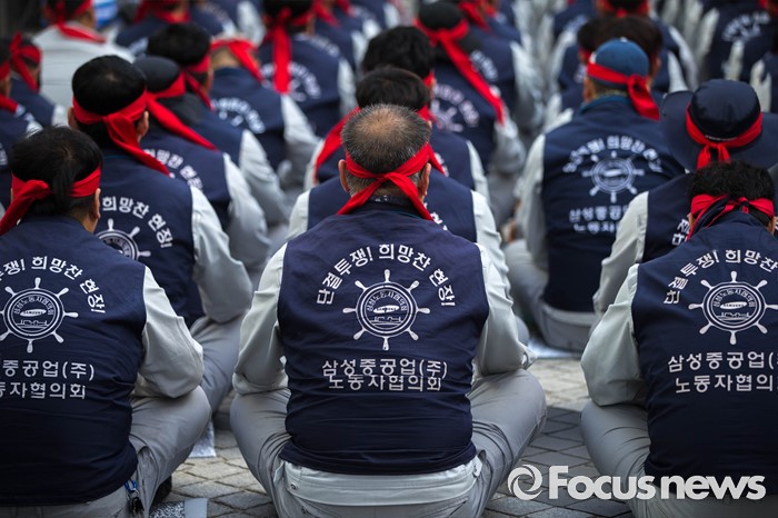 (서울=포커스뉴스) 29일 오전 서울 서초구 삼성 사옥 앞에서 삼성중공업 노동협의회 관계자들이 구조조정에 반대하는 시위를 하고 있다. 삼성중공업은 지난 15일 임원들의 임금 반납, 희망퇴직 등이 포함된 구조조정안을 공개했으며 올해 약 1500명 규모의 희망퇴직을 단행할 계획이라 밝혔다.