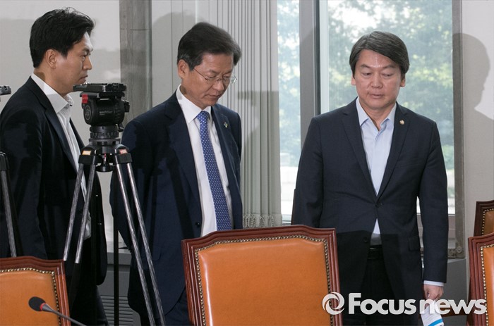 (서울=포커스뉴스) 29일 오전 서울 여의도 국회에서 열린 국민의당 최고위원회의에 참석한 안철수(오른쪽부터) 상임공동대표와 천정배 공동대표, 손금주 대변인이 대화하고 있다.