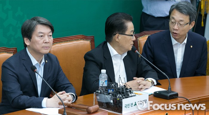 (서울=포커스뉴스) 29일 오전 서울 여의도 국회에서 열린 국민의당 최고위원회의에 참석한 박지원(가운데) 원내대표와 김성식(오른쪽) 정책위의장이 대화하고 있다. 왼쪽은 안철수 상임공동대표.