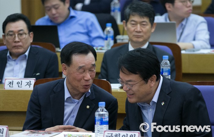 (서울=포커스뉴스) 29일 오전 서울 여의도 국회 의원회관에서 열린 새누리당 중앙위원회 혁신을 위한 대토론회에 참석한 정진석(오른쪽) 원내대표와 김기선 제1사무부총장이 대화하고 있다.