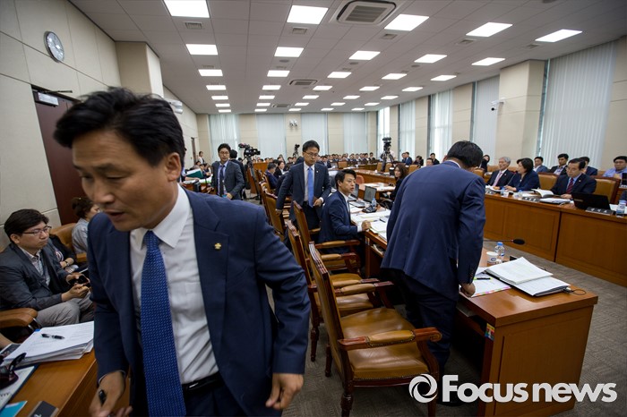 (서울=포커스뉴스) 29일 오전 서울 여의도 국회에서 열린 '안전행정위원회 전체회의'에서 더불어민주당 위원들이 강신명 경찰청장에게 살수차 공개를 요구하며 질의응답을 거부한 채 퇴장 하고 있다.