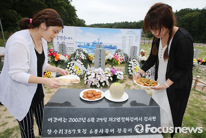 (대전=포커스뉴스) 제2연평해전 14주기를 맞은 29일 오전 대전 유성구 국립대전현충원 제2연평해전 전사자 묘역에서 인터넷 다음카페 제2연평해전 추모본부 정소영(오른쪽), 김수연 회원이 묘역에 차례상을 차려 놓고 있다.