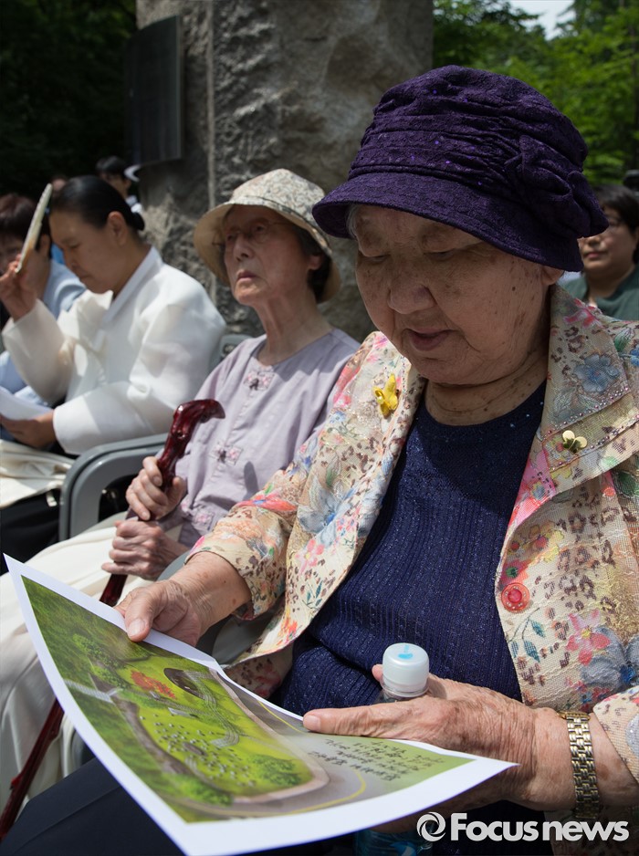 (서울=포커스뉴스) 29일 오전 서울 중구 예장동 옛 통감관저 터에서 열린 일본군 위안부 피해자 추모공원 '기억의 터' 기공식에 참석한 길원옥 할머니가 공원 조감도를 살펴보고 있다.
