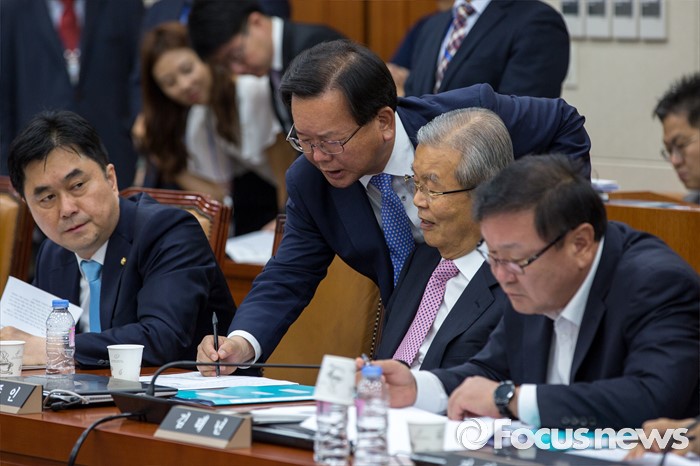 (서울=포커스뉴스) 김종인(오른쪽 두 번째) 국회 기획재정위원회 더불어민주당 위원과 김부겸(왼쪽 두 번째) 국회 기획재정위원회 더불어민주당 위원이 29일 오전 서울 여의도 국회에서 열린 '기획재정위원회 전체회의'에 참석해 대화를 나누고 있다.