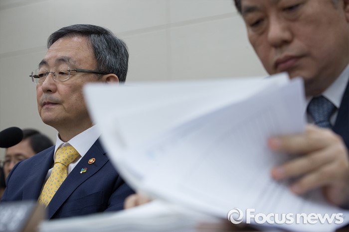 (서울=포커스뉴스) 최성준(왼쪽) 방송통신위원장이 29일 오전 서울 여의도 국회에서 열린 미래창조과학방송통신위원회 전체회의에 출석하고 있다.