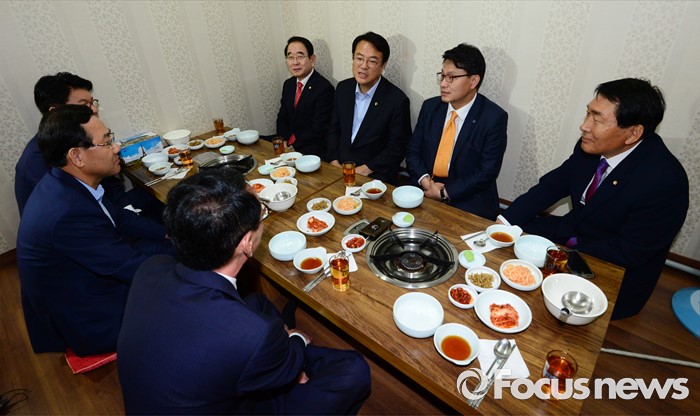(서울=포커스뉴스) 정진석 새누리당 원내대표, 박명재 사무총장, 김도읍 원내수석부대표가 29일 오후 서울 여의도 한 음식점에서 열린 복당 의원들과의 오찬에 참석해 의원들과 대화하고 있다. 이날 오찬에는 최근 복당한 안상수, 윤상현, 장제원, 주호영 의원 등이 참석했다.