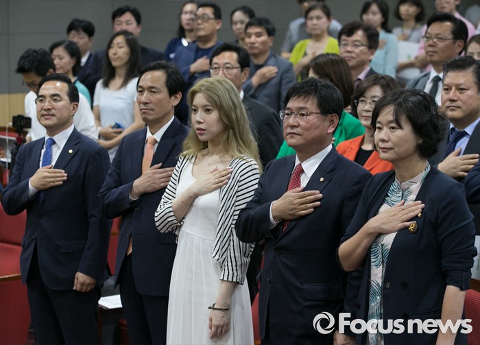 (서울=포커스뉴스) 29일 오후 서울 여의도 국회 의원회관에서 열린 동물복지포럼 출범식에 참석한 우상호 더불어민주당 원내대표, 이정미 정의당 원내수석부대표, 가수 배다해 등 의원 및 참석자들이 국기에 대한 경례를 하고 있다.