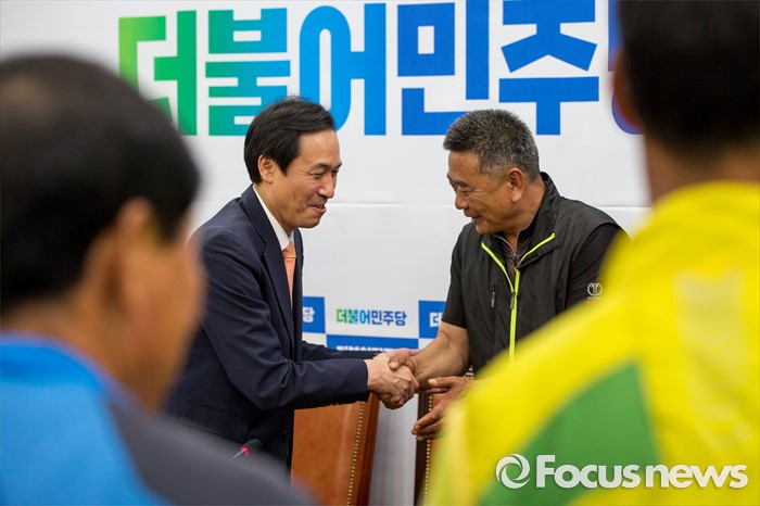 (서울=포커스뉴스) 우상호 더불어민주당 원내대표가 29일 오후 서울 여의도 국회에서 열린 '서해 5도 중국어선 불법조업 대책 마련 및 해양주권 수호 위안 협약식'에 참석한 박태원 연평도 어촌계장과 악수 하고 있다.