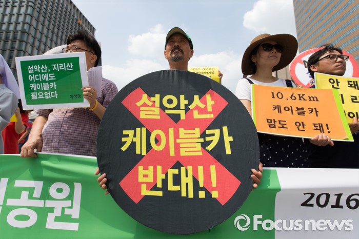 (서울=포커스뉴스) 설악산국립공원지키기국민행동 등 환경단체가 29일 오후 서울 광화문광장에서 설악산-지리산국립공원 케이블카추진 공동 규탄 기자회견을 하고 있다.