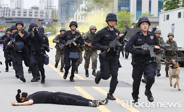 (세종=포커스뉴스) 29일 오후 세종시 정부세종청사경비대에서 열린 적 특수전부대원 침투 및 화학폭탄 폭발 대응 민·관·군·경 합동 민방위훈련에서 32시단 병력과 경력들이 테러범을 추적하고 있다.