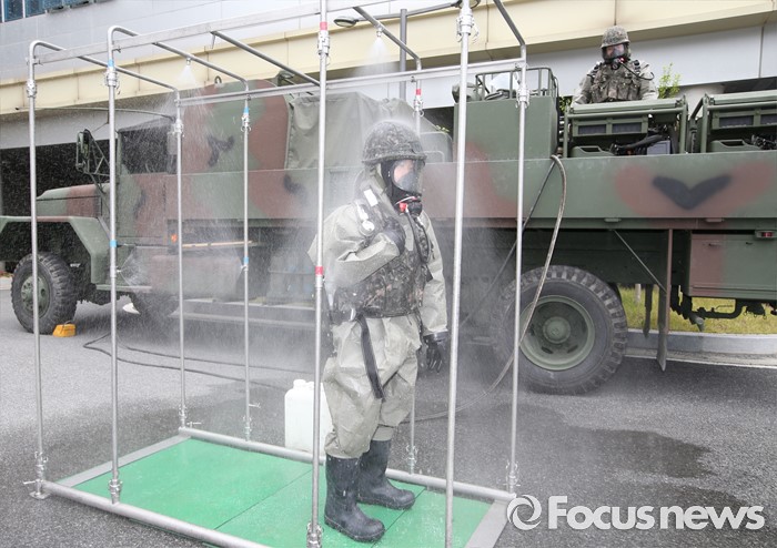 (세종=포커스뉴스) 29일 오후 세종시 정부세종청사경비대에서 열린 적 특수전부대원 침투 및 화학폭탄 폭발 대응 민·관·군·경 합동 민방위훈련에서 32시단 화학대대 병력들이 화학폭발물 수거를 마치고 제독하고 있다.