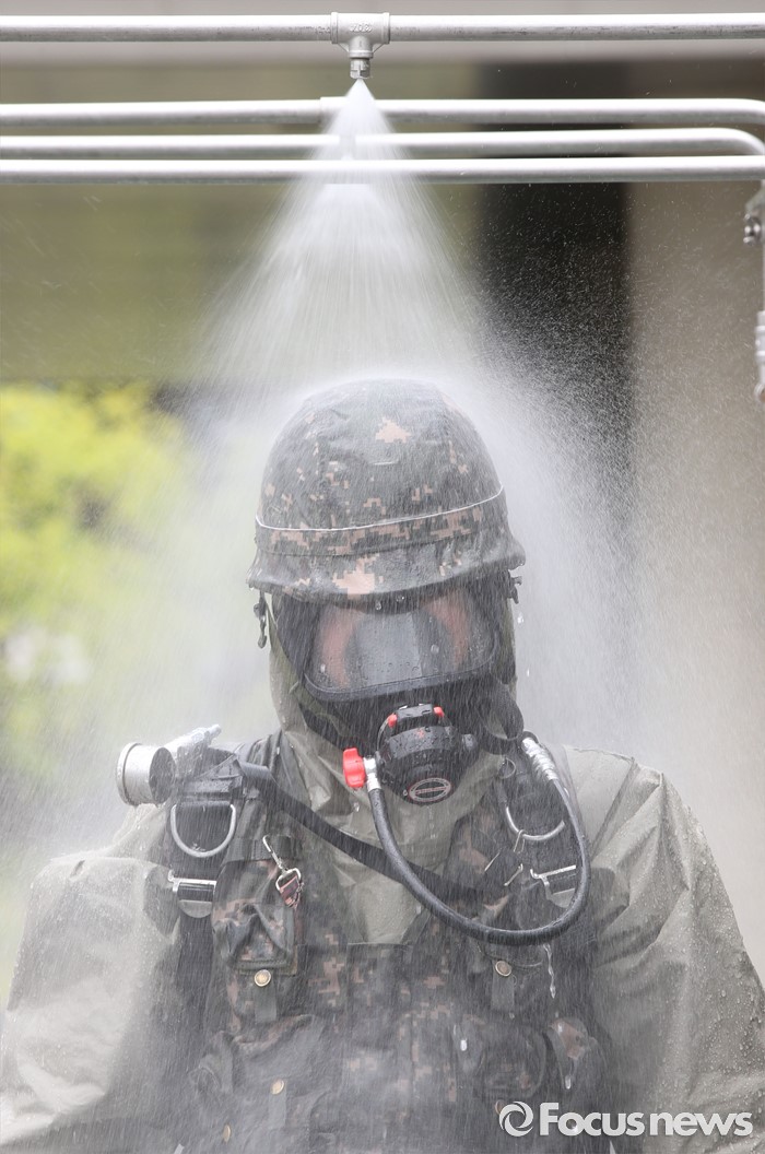 (세종=포커스뉴스) 29일 오후 세종시 정부세종청사경비대에서 열린 적 특수전부대원 침투 및 화학폭탄 폭발 대응 민·관·군·경 합동 민방위훈련에서 32시단 화학대대 병력들이 화학폭발물 수거를 마치고 제독하고 있다.