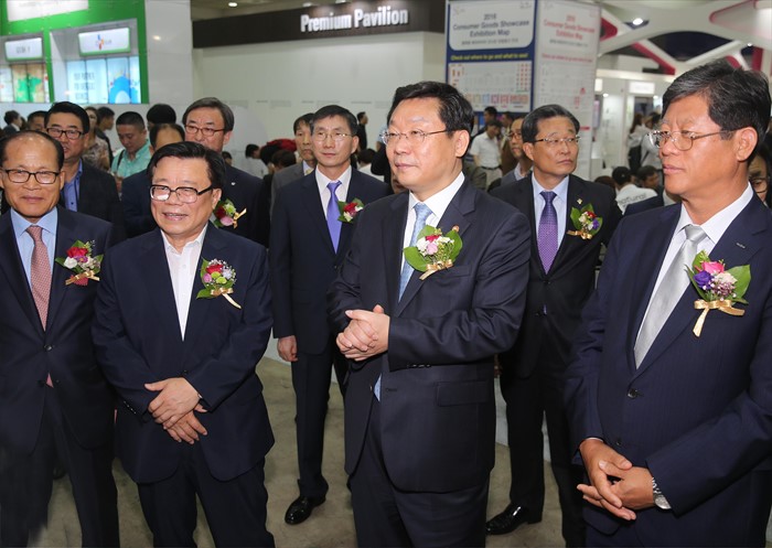 (서울=포커스뉴스) 주형환 산업통상자원부 장관과 이동필 농림축산식품부장관이 29일 서울 강남구 삼성동 코엑스에서 열린 2016 대한민국 소비재 수출대전에 참석해 전시물을 둘러보고 있다. <사진제공=산업통상자원부>