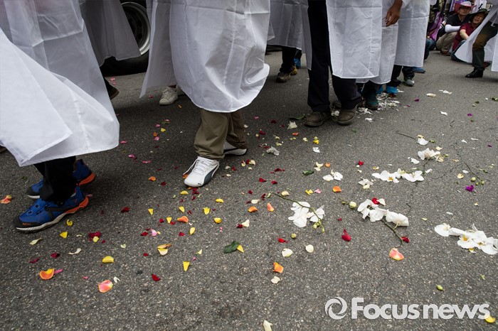 (서울=포커스뉴스) 29일 오후 서울 영등포구 국회의사당 인근에서 전국화훼협회 등 27개 단체원들이 김영란법 반대를 외치며 꽃상여를 메고 행진하고 있다.