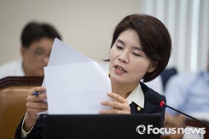 (서울=포커스뉴스)한정애 더불어민주당 의원이 29일 오후 서울 여의도 국회에서 열린 환경노동위원회 전체회의에서 고용노동부에서 만든 성과연봉제 웹툰을 비판하고 있다.