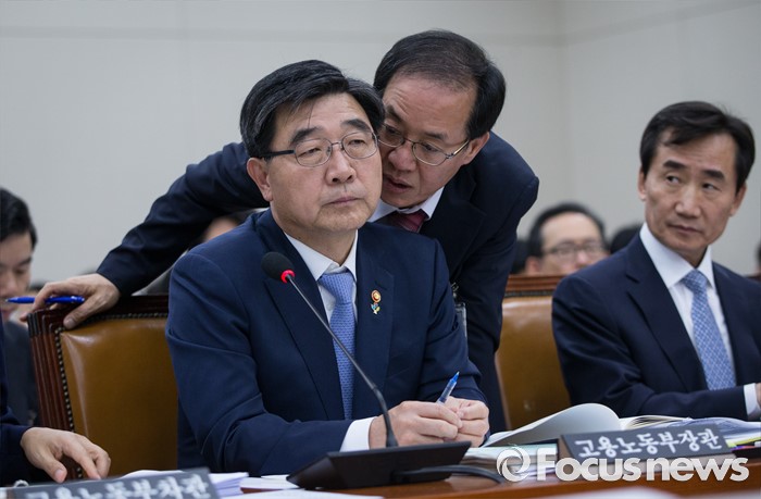 (서울=포커스뉴스) 이기권 고용노동부 장관이 29일 오후 서울 여의도 국회에서 열린 환경노동위원회 전체회의에서 고용노동부 관계자로부터 귀엣말을 듣고 있다.