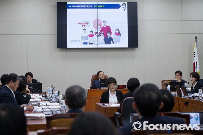 (서울=포커스뉴스) 29일 오후 서울 여의도 국회에서 열린 환경노동위원회 전체회의에서 의원들이 고용노동부 정책 홍보 영상을 보고 있다.