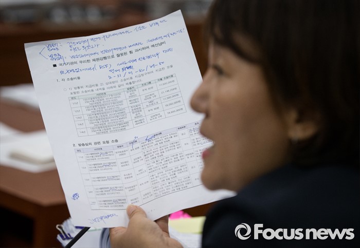 (서울=포커스뉴스) 이재정 더불어민주당 의원이 29일 오후 서울 여의도 국회에서 열린 미래창조과학방송통신위원회 전체회의에 서 박효종 방송통신 심의위원회 위원장에게 "국가기관의 무리한 재판 강행으로 잘 못된 힘을 과시하며 예산 낭비"를 하고 있는 것이 아니냐며 비판하고 있다.