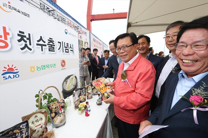 (군산=포커스뉴스) 이동필 농림축산식품부 장관이 29일 전북 군산항 컨테이너터미널에서 열린 대 중국 삼계탕 첫 수출 기념식 행사장에서 송하진 전라북도지사 등이 참석한 가운데 수출삼계탕을둘러보고 있다.