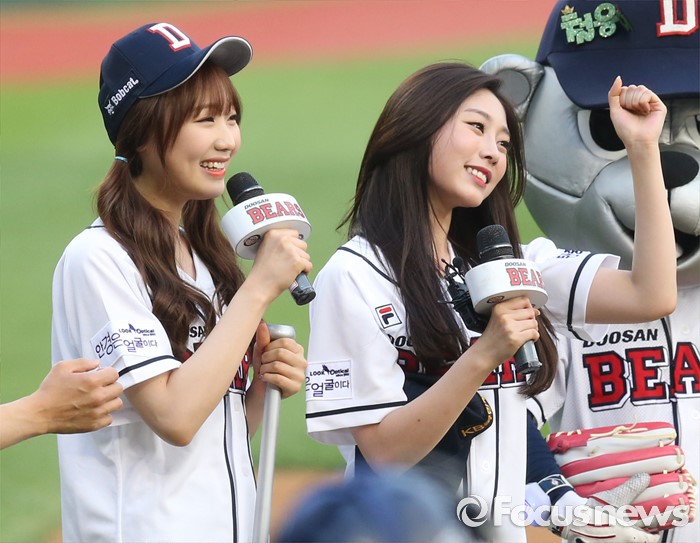 (서울=포커스뉴스) 29일 서울 잠실구장에서 열린 2016 프로야구 NC-두산 경기에서 걸그룹 '러블리즈'의 서지수(오른쪽)와 류수정이 시구, 시타 전에 관중에게 인사하고 있다.
