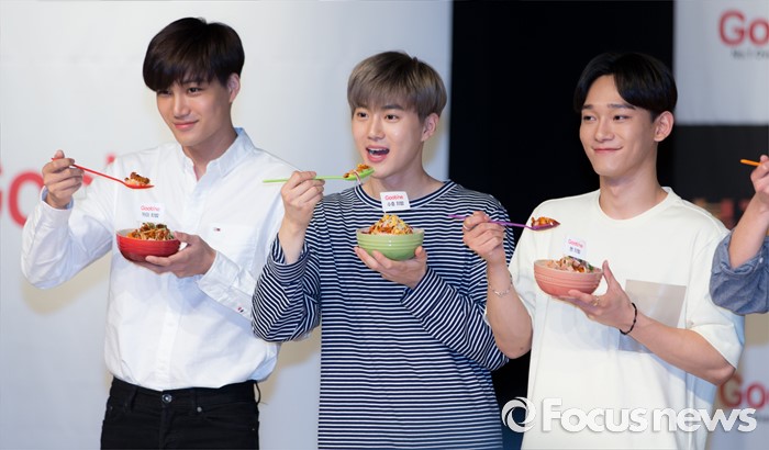 (서울=포커스뉴스) 29일 오후 서울 강남구 일지아트홀에서 열린 '굽네 볼케이노와 함께하는 엑소(EXO) 치밥 쿠킹 팬사인회'에서 카이(왼쪽부터), 수호, 첸이 포즈를 취하고 있다.