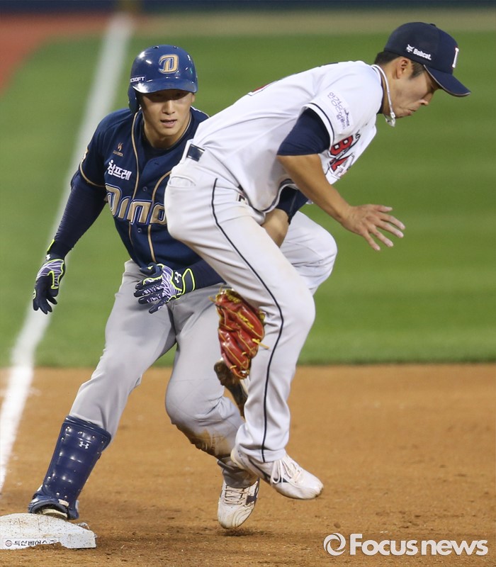 (서울=포커스뉴스) 29일 서울 잠실구장에서 열린 2016 프로야구 NC-두산 경기 4회초 1사 2,3루에서 NC 나성범이 우익수 오른쪽에 떨어지는 타구를 날리고 3루에서 세이프되고 있다.