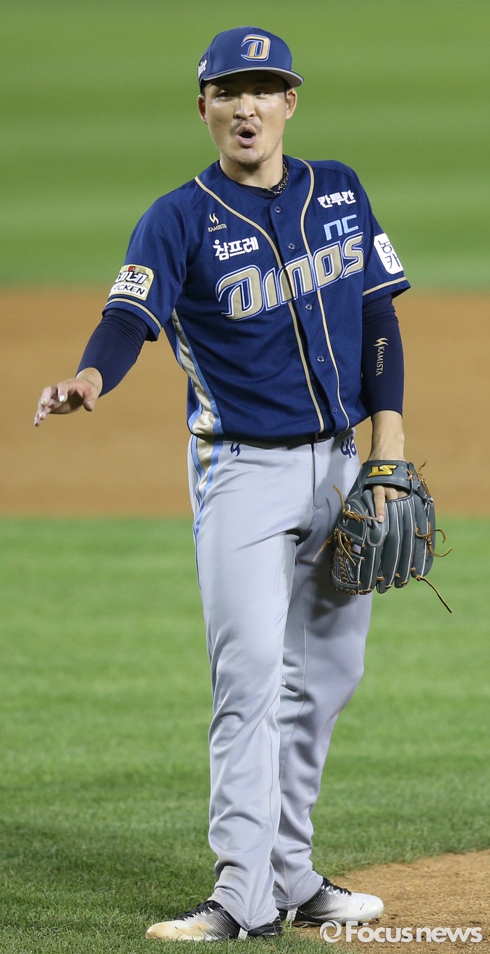 (서울=포커스뉴스) 29일 서울 잠실구장에서 열린 2016 프로야구 NC-두산 경기에서 NC 투수 원종현이 8회말에 등판해 투구하며 포수 김태군에게 사안을 보내고 있다.