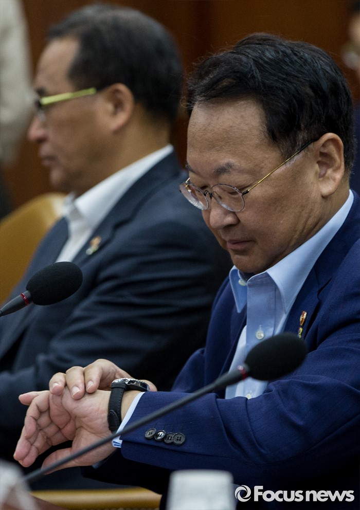 (서울=포커스뉴스) 30일 오전 서울 종로구 정부서울청사에서 열린 제2차 산업경쟁력 강화 관계장관회의에 참석한 유일호 부총리 겸 기획재정부 장관이 시계를 보고 있다.