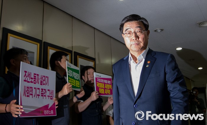 (서울=포커스뉴스) 30일 오전 서울 중구 프레스센터에서 열린 제45차 고용정책심의회에 이기권 고용노동부 장관이 참석하는 가운데 양대노총 관계자들이 구조조정 중단을 요구하는 구호를 외치고 있다.