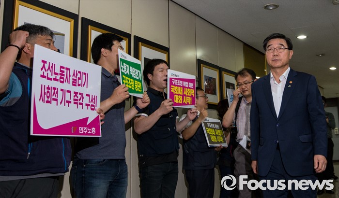 (서울=포커스뉴스) 30일 오전 서울 중구 프레스센터에서 열린 제45차 고용정책심의회에 이기권 고용노동부 장관이 참석하는 가운데 양대노총 관계자들이 구조조정 중단을 요구하는 구호를 외치고 있다.