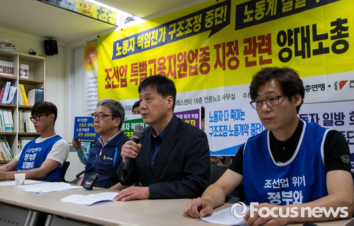 (서울=포커스뉴스) 30일 오전 서울 중구 프레스센터에서 열린 조선업 특별고용지원업종 지정 관련 양대노총 기자회견에 참석한 박대수 한국노총 부위원장이 발언하고 있다.
